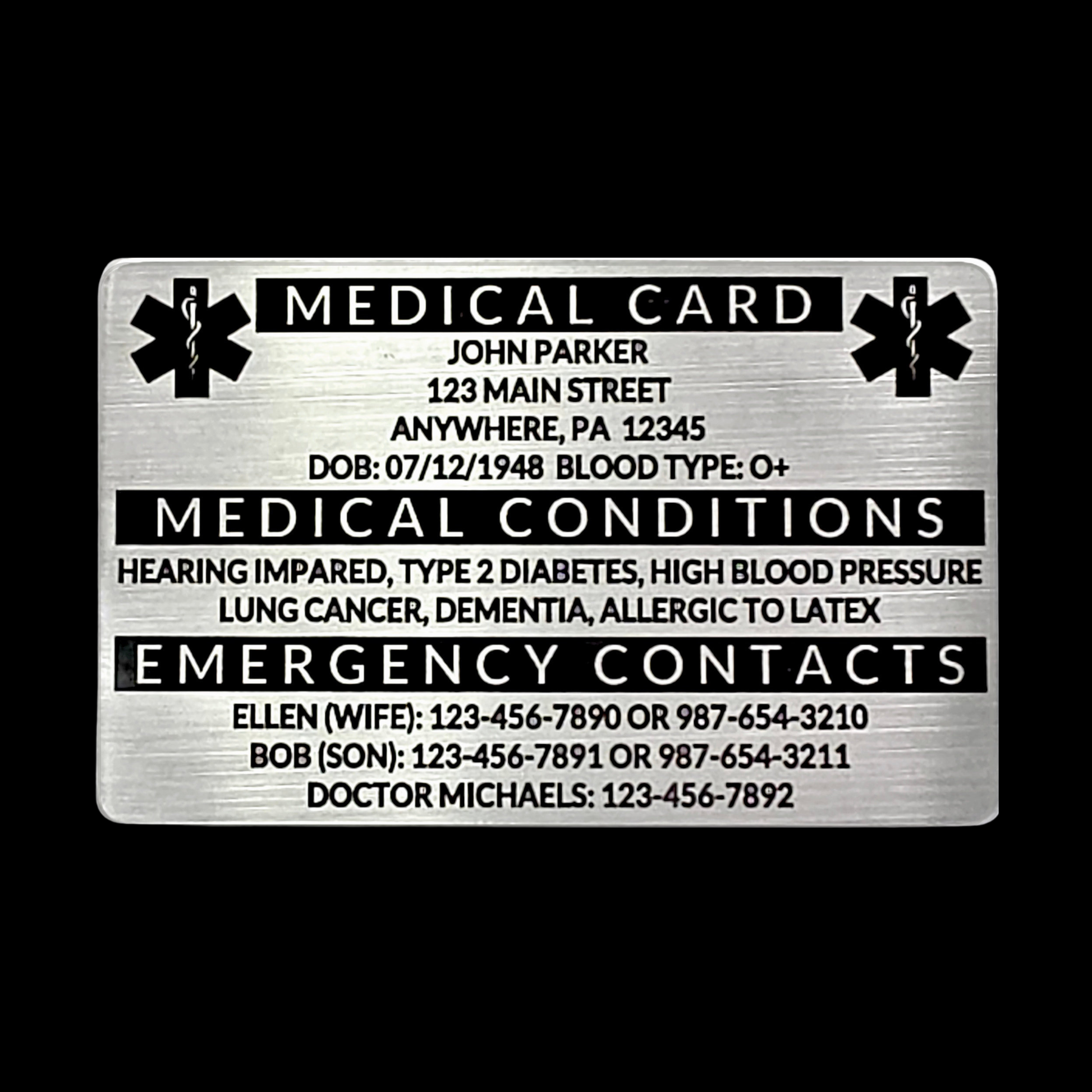 Our Custom Engraved Stainless Steel Medical ID Card is a durable, wallet-sized way to store critical medical details and emergency contacts in case of an accident or emergency.