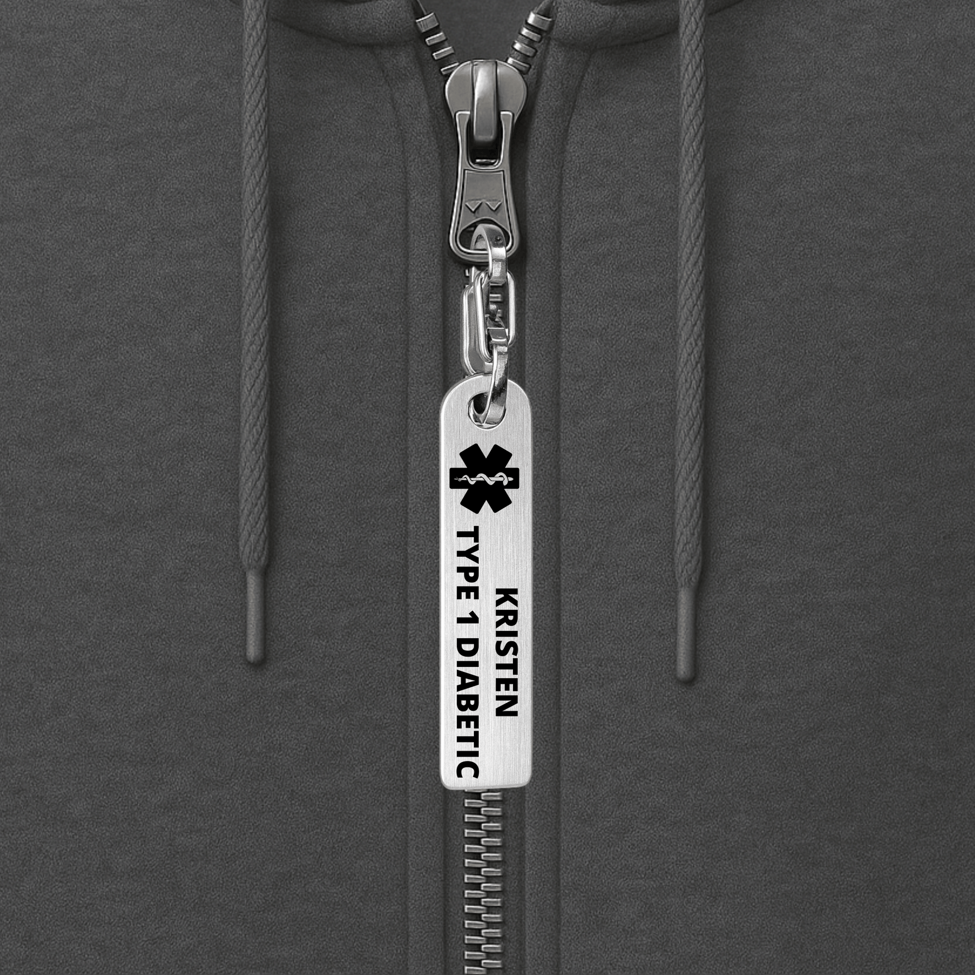 Simple safety that goes anywhere. This custom stainless steel zipper pull makes medical info easy to spot and easy to carry — no wristband or necklace needed. Clip it to a jacket, backpack, purse, or lunch bag for quick ID in an emergency.